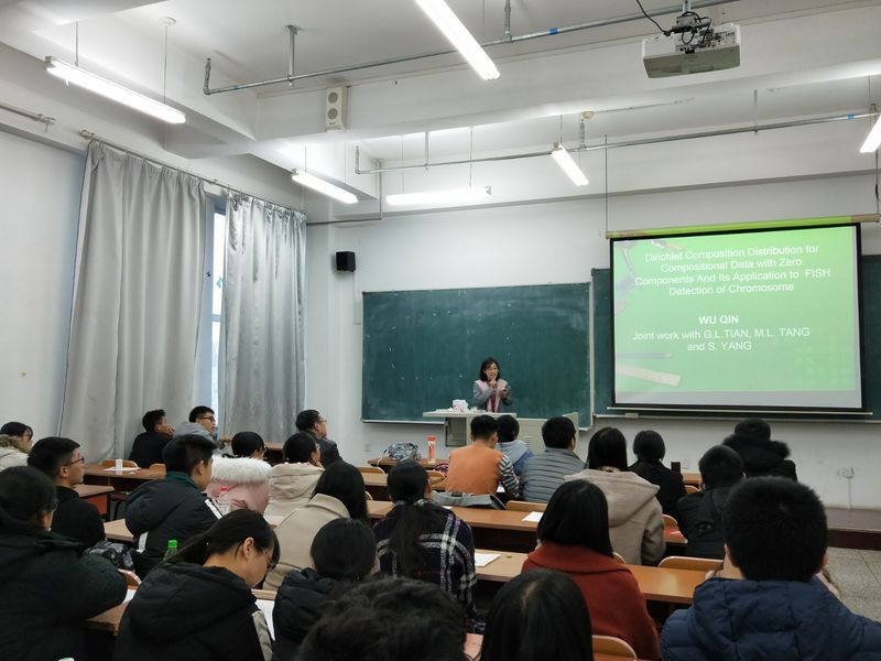 荣邀华南师范大学概率统计系博士吴琴莅临我院做学术报告。报告由学院副院长徐平峰主持,学院副院长王纯杰、学院部分老师、研究生、及本科生和其他学院师生参加了本次学术报告会。