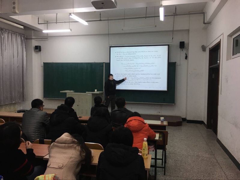 报告会中,周望老师从多元中的“独立”引出报告的主题,给出了条件独立的新概念。又利用了图模型说明了条件独立的背景。首先,提出“HCDCov函数”并给出性质和缺点,高阶特征函数可以通过低阶特征函数表示,又给出“JHCDCov”。接着,在相合性定理的基础上,进行独立的研究。之后,在理论的基础上,周老师给出了三个例子,用以说明理论的应用。最后,周老师对同学们提出的问题进行了详细的解答,也与学院里的老师进行了深入的互动。