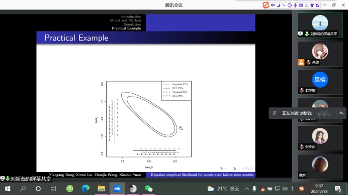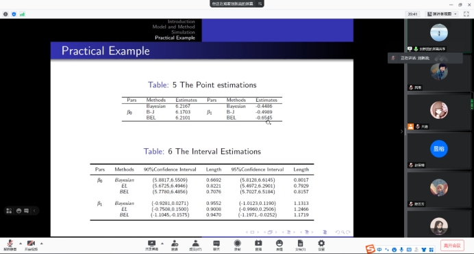 报告会中,刘新蕊博士首先回顾了各个方法的利弊。然后,通过引入先验,在Buckley-James估计的基础上构造了贝叶斯经验似然函数。随后,利用MH算法对贝叶斯经验似然和贝叶斯估计以及B-J估计和经验似然进行了仿真研究。仿真结果表明,贝叶斯经验似然估计比贝叶斯估计、B-J估计和经验似然估计具有更好的实用性能。最后,将该方法应用于实例分析,得到了较窄的模型参数置信区间。使大家对于B-J估计及贝叶斯估计有了更加深入的了解和兴趣。