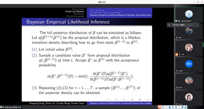 与会人员积极参与讨论,对于刘新蕊博士讲解的右删失数据的贝叶斯经验似然进行了热烈的讨论和交流,刘新蕊博士就提出的问题进行了详细的解答。本次学术交流会使大家深入了解了贝叶斯经验似然及应用,开拓了同学们的视野,聆听报告的研究生均表示受益颇多。