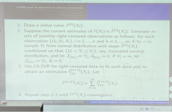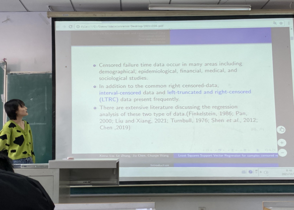 会议过程中,刘新蕊同学以其清晰的思路和严谨的思维行云流水地向硕士研究生们展示了其论文的主要思想和研究过程,即为了克服回归估计时的困难响应服从区间截尾或左截尾和右截尾,提出了最小二乘支持向量回归(LS-SVR)算法和一种加权算法关于最小二乘支持向量回归程序。通过统计方法研究,其论文模拟结果表明,所提出的方法能有效地减少回归误差。刘新蕊同学最终通过各个领域的实际数据验证了其研究的泛化能力,为今后类似的数理统计研究提供了很好的思路。