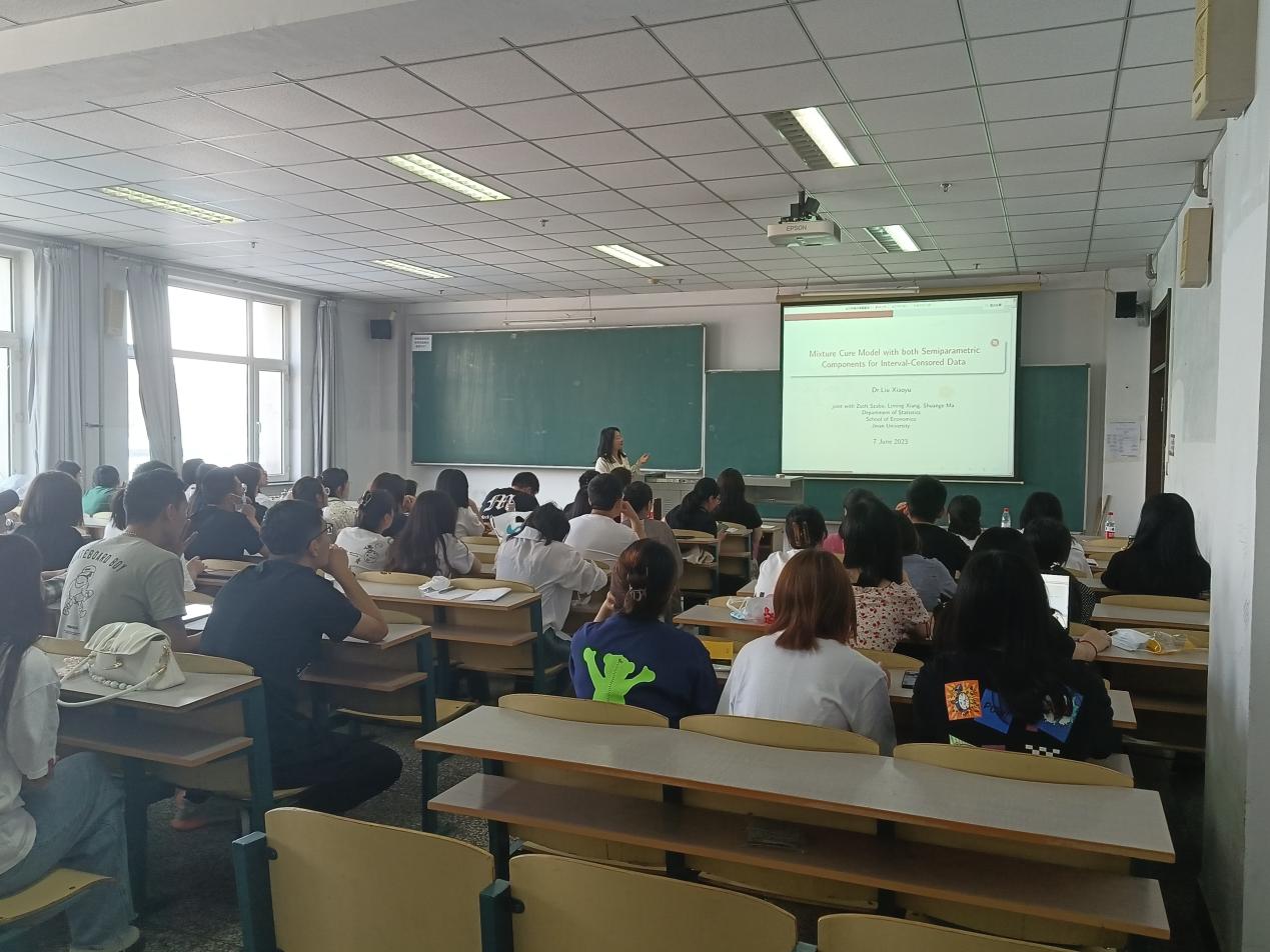 在接下来的报告中,刘晓玉教授围绕“Mixture Cure Model with both Semiparametric Components for Interval-Censored Data”开始讲解,通过生存分析删失数据、线性和非线性协变量、左删失、区间删失、右删失等方面进行知识讲解,用通俗易懂的语言与生活等其他方面都进行了联系与结合,由浅入深地向同学们讲解相关知识,使枯燥的知识变得有意思起来。