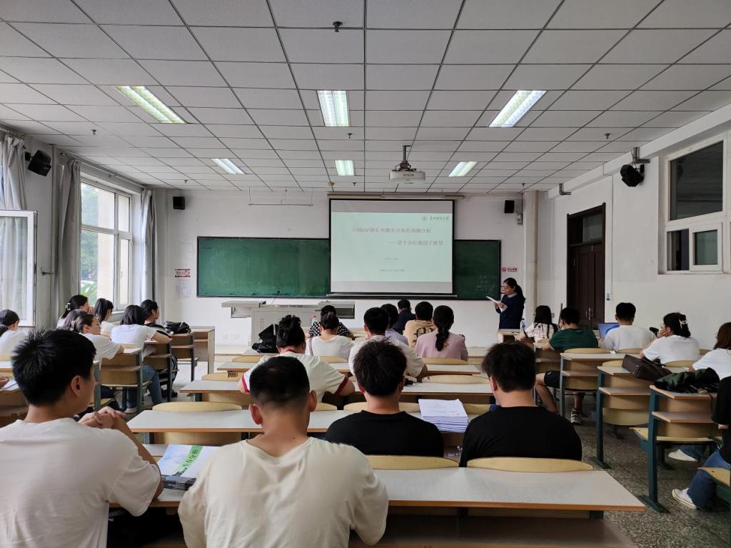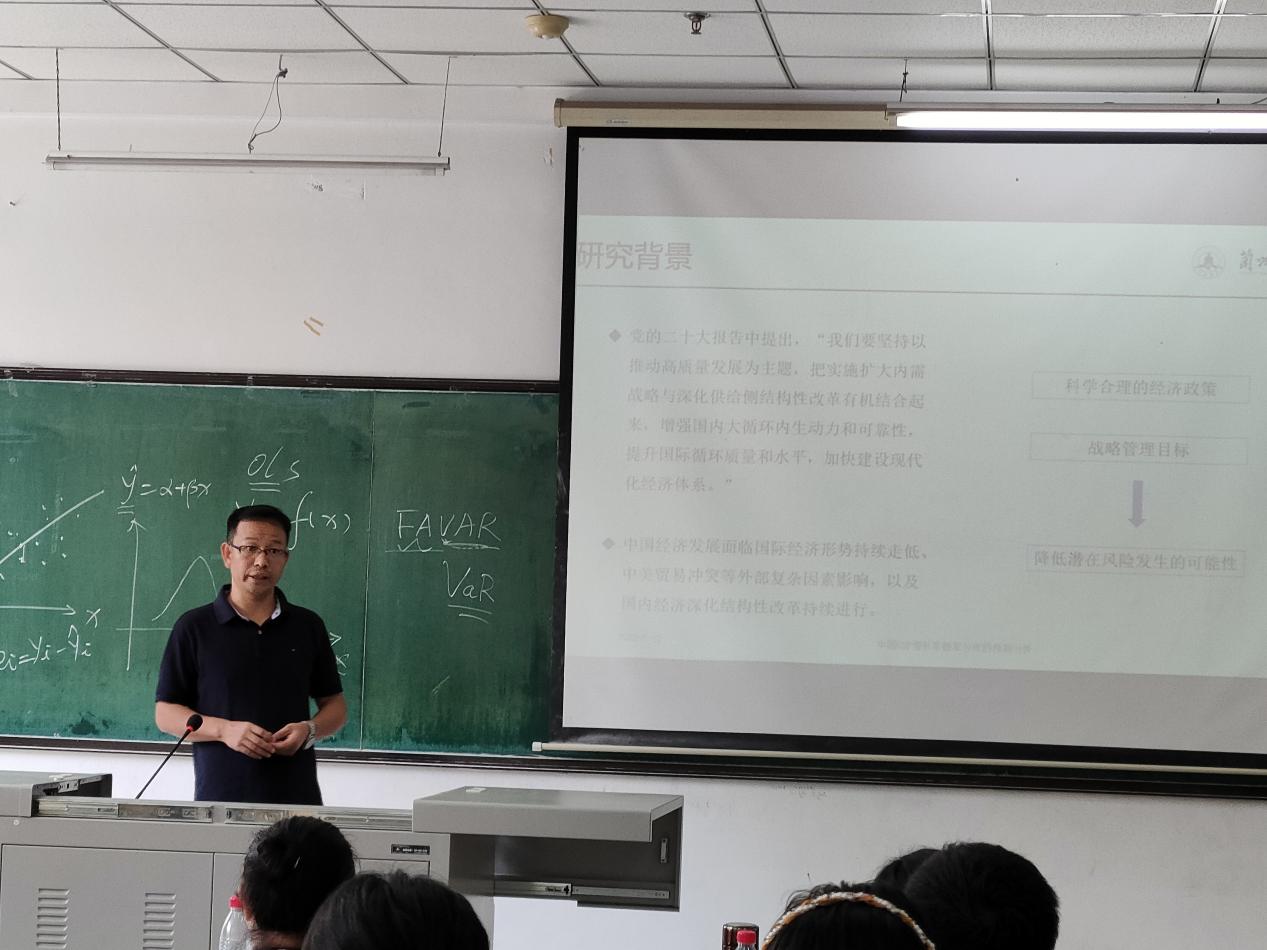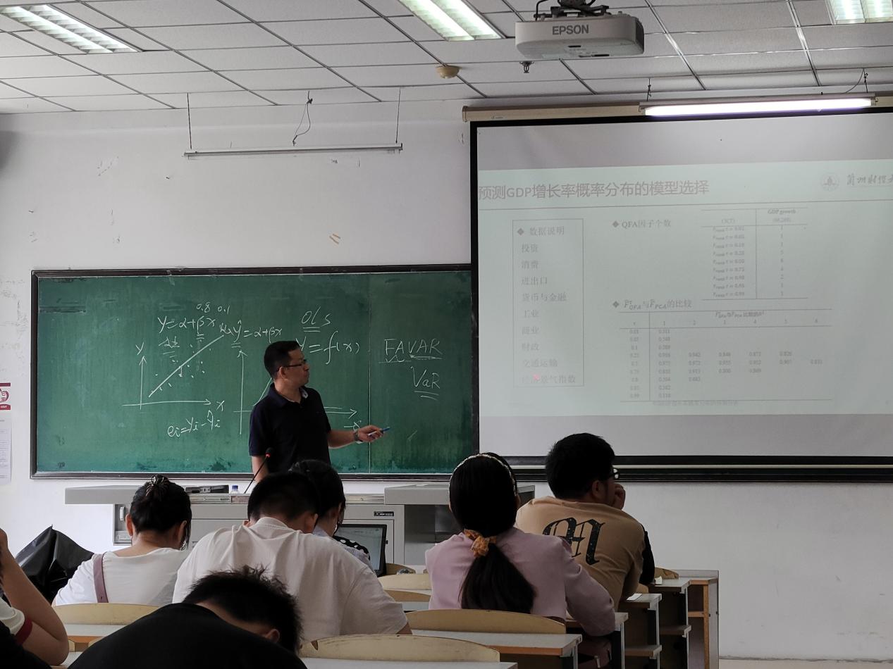本次会议,肖强教授通过研究背景,生活实例,文献综述等方面向我们讲解了基于分位数因子模型。首先向我们介绍了本次会议涉及到的名词的概念,如动态因子模型,分位数因子模型等相关知识,接着又在黑板上利用数形结合的办法,让我们对基于分位数因子模型知识有了更进一步的认识,其次还给我们普及了各个领域中涉及到的统计知识和取得成绩的一些名人,还从不同的角度,分享了自己的研究经验和学习方法,为我院师生提供了宝贵的参考和借鉴。接着肖强教授用专业和简洁的语言对本次会议做出了讲解,最后部分同学向肖强教授提出了自己的想法的疑问,肖强教授都一一详细且认真的给出了答案。