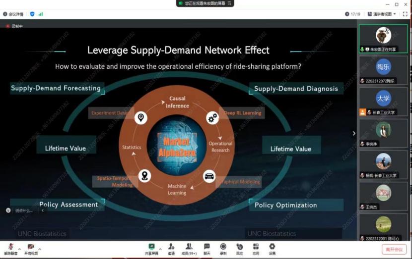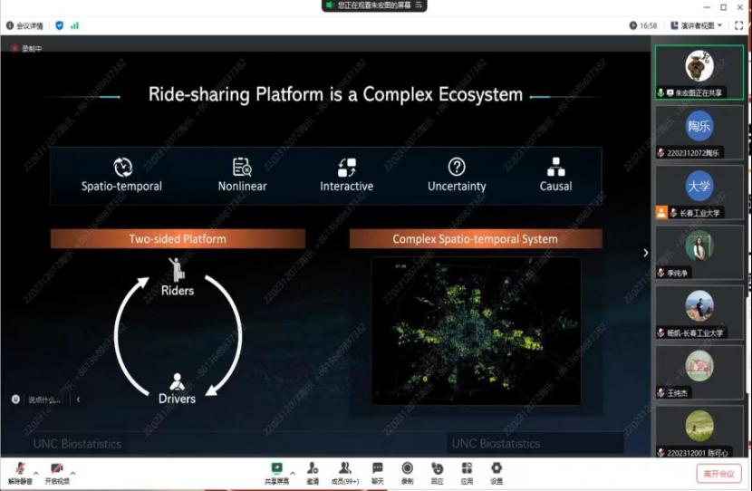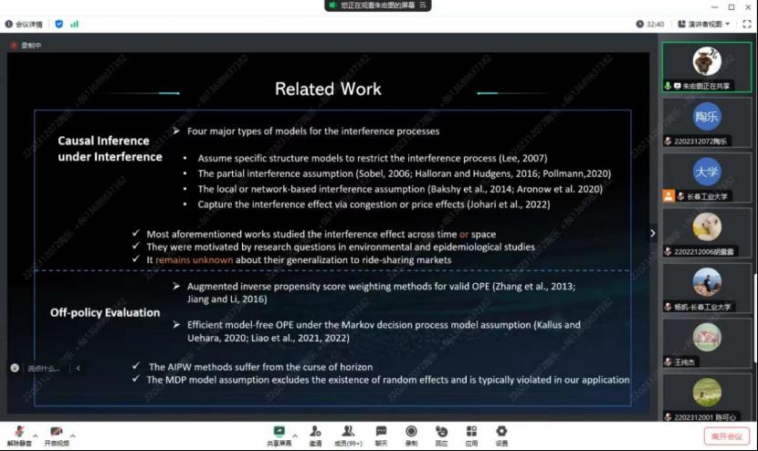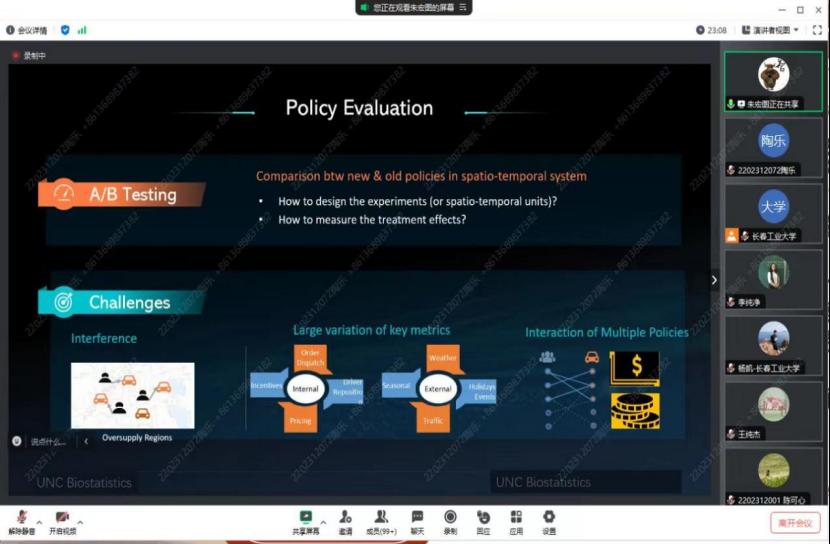 在报告中,朱教授从现代科技公司入手,如谷歌、优步和滴滴,对分析平台政策和感兴趣的结果之间的因果关系进行了阐述,朱教授提出了VCDP模型来描述动态的治疗效果。进而在基于OPE方法的估计程序下提出了三个动态环境下序贯治疗的最佳分配策略,此策略会有效减少治疗效果估计的方差。通过朱教授的讲解同学们了解到研究结果要根据大量的模拟和真实的数据得出,同学们纷纷表示在今后的学习生活中要脚踏实地。