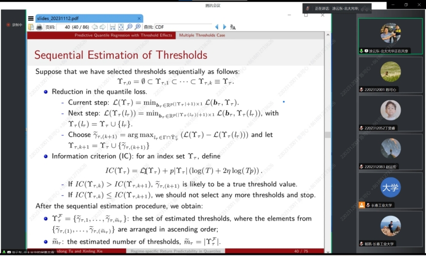 在接下来的讲解中,涂云东教授为我们介绍了分位数回归预测的性质,每个预测子的可预测性可以根据阈值变量的值从一种状态切换到另一种状态,并且可以在分位数之间变化,并且预测器可以具有不同程度的持久性。提出了一种与自适应群Lasso相结合的序列估计方法,以有效且一致地估计未知的多个阈值。为了消除序列估计中模型错误指定对阈值后续推断的影响,进一步考虑了阈值的分区估计。所得到的阈值估计量不渐近地依赖于来自其他状态的参数,并且具有对称的极限分布。最后采用自适应Lasso来识别每个方案中的重要预测因子,以提高每个分位数的预测精度。蒙特卡罗模拟证明了该方法在有限样本中的良好性能。对美国股票收益率的实证分析表明,收益率的可预测性随着经济政策不确定性的不同而变化。