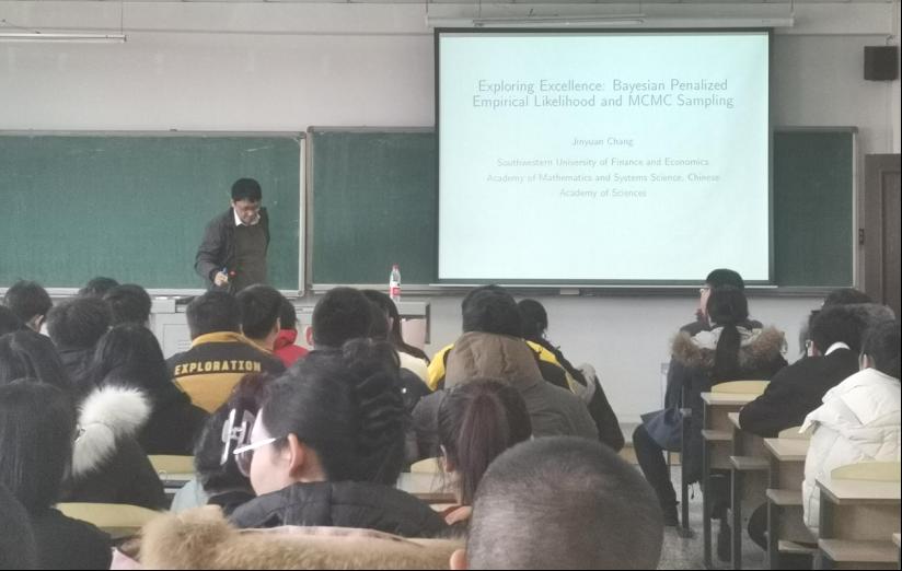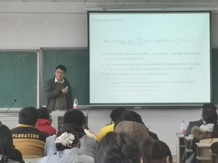 在接下来的报告中,常教授介绍了高维经验似然、惩罚经验似然,及PEL的计算问题,并指出优化方法的性能一定程度上依赖于初始点的选择。由于研究的是高维数据,所以还讲解了非凸问题的抽样技术,以及贝叶斯经验似然估计方法。通过数值模拟实验,与其他已有的方法进行比较,本次研究所提出的方法具有更好的精确性与鲁棒性。