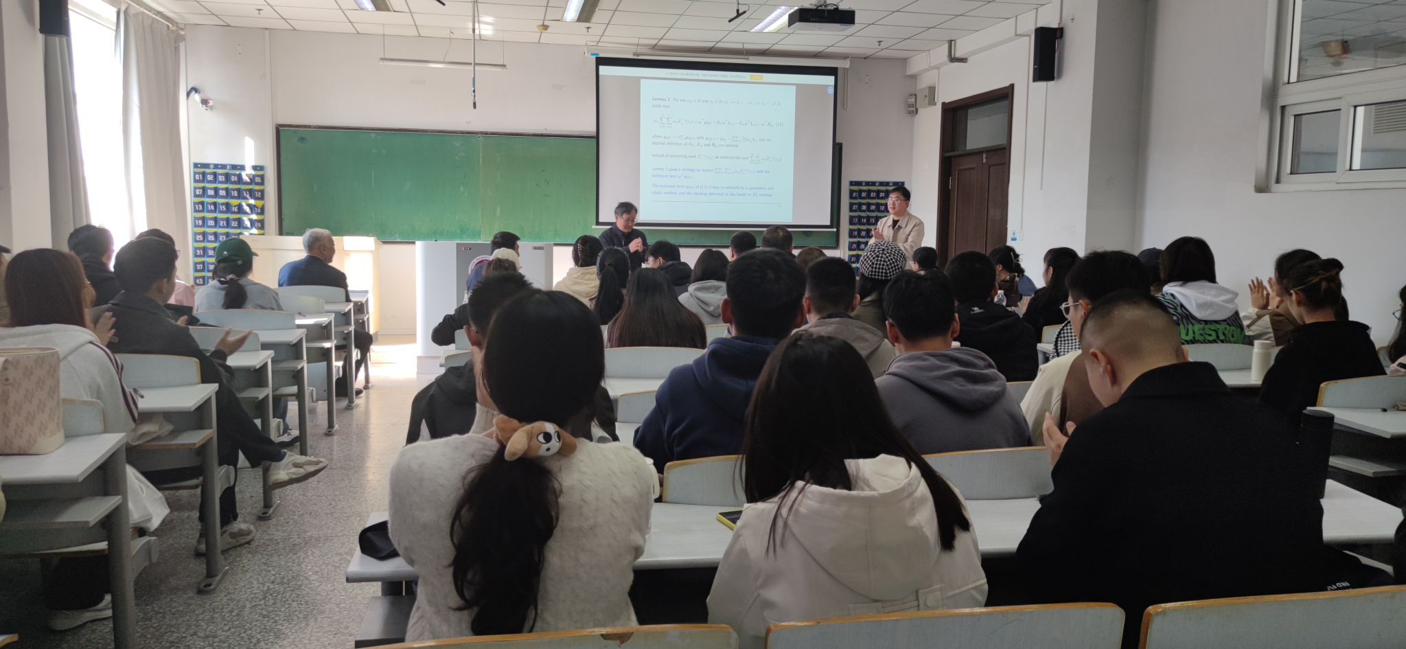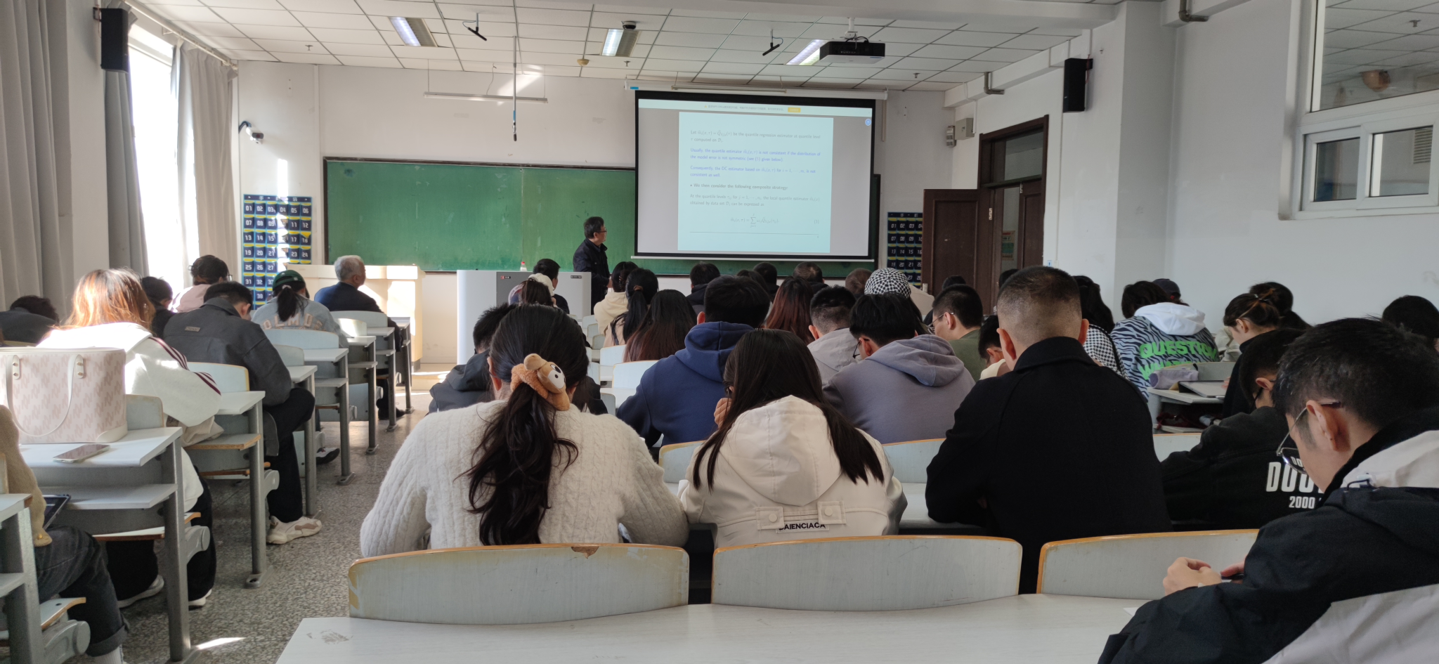 报告会中,林教授主要介绍了在海量数据回归中的量子匹配直流的相关问题。由于在非对称误差分布的模型中,加权复合量化回归(WCQR)可以纠正复合量化回归(CQR)的不可忽略的偏差,但对于一些误差依赖的非参数函数,权重的选择严重依赖于非参数先导估计,因此对异常值和胖尾分布也不具有鲁棒性。故而针对具有一般误差分布的非参数模型,探索了一种新的基于直流的 WCQR 方法。通过充分利用模型结构,提出了一种量化匹配复合方法。其中通过选择稳健权重,就可以轻松纠正不可忽略的偏差。根据对比新方法的估计精度高、鲁棒性更强。