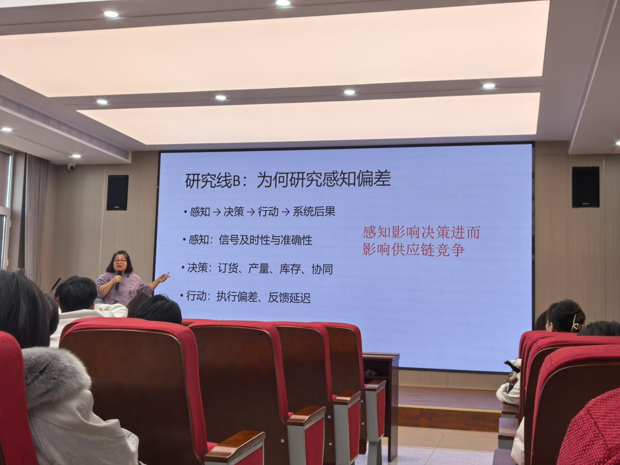 随后钟教授展开B线“感知偏差、决策规则与系统效率”的讲解,该线围绕“感知→决策→行动→系统后果”逻辑,解析感知信号的及时性与准确性、订货库存协同等决策要素、行动执行偏差等要点,明确感知影响决策进而作用供应链竞争的关联,依托仿真工具探究其机制,与其他研究线协同支撑交叉研究的实践与学术维度。