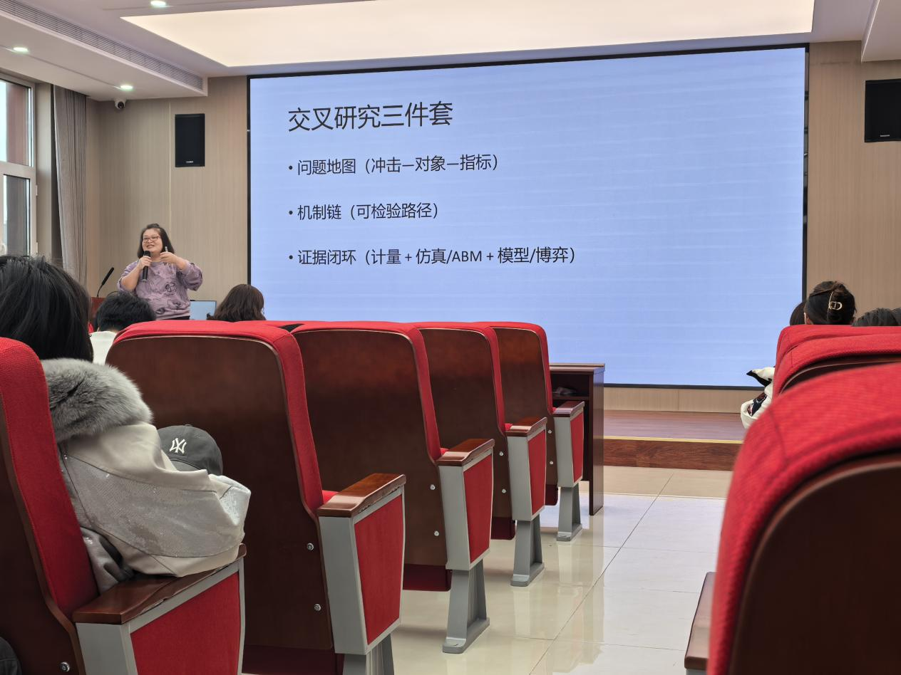 在讲解完研究线后,钟翠萍教授进一步分享了支撑供应链交叉研究的交叉研究三件套方法工具:其一为问题地图,以“冲击-对象-指标”明确研究切入点;其二是机制链,梳理可检验的逻辑路径;其三是证据闭环,整合计量、仿真、ABM 等多元方法完成验证。这套工具为此前两类研究逻辑与五条研究线提供了方法支撑,让交叉研究既锚定实践问题,又能通过严谨路径完成论证。