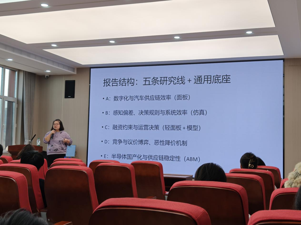 之后,钟教授向大家介绍了报告的“五条研究线+通用底座”结构,并说明了每条研究线对应不同主题与方法:A线聚焦“数字化与汽车供应链效率”,采用面板分析方法;B线围绕 “感知偏差、决策规则与系统效率”展开,依托仿真工具探究;C线研究“融资约束与运营决策”,结合轻面板与模型双维度;D线剖析“竞争与议价博弈、恶性降价机制”;E线关注“半导体国产化与供应链稳定性”,借助ABM方法分析。五条研究线各有侧重,搭配通用底座,共同构成报告的完整研究框架。