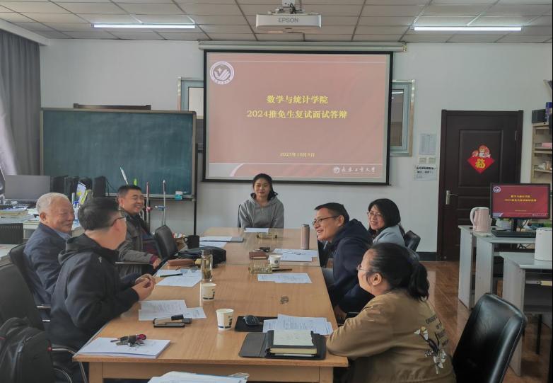 10月8日上午9:30,在南湖校区新图书馆302,召开了2024推免生复试的面试答辩会。学院院长王纯杰教授、校学术委员会副主任董小刚教授、副院长刘铭教授、副院长杨凯副教授、统计系党支部书记袁晓惠教授参与会议。答辩会由院长王纯杰教授主持。