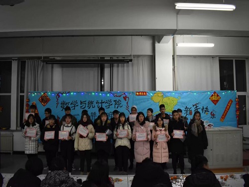 在元旦联欢晚会期间,还进行了在本学期各项学术竞赛与文体活动的颁奖典礼,表彰了一学期来的数理知识竞赛、羽毛球大赛、校园十佳歌手大赛、PPT制作大赛等活动中取得优秀成绩的个人。