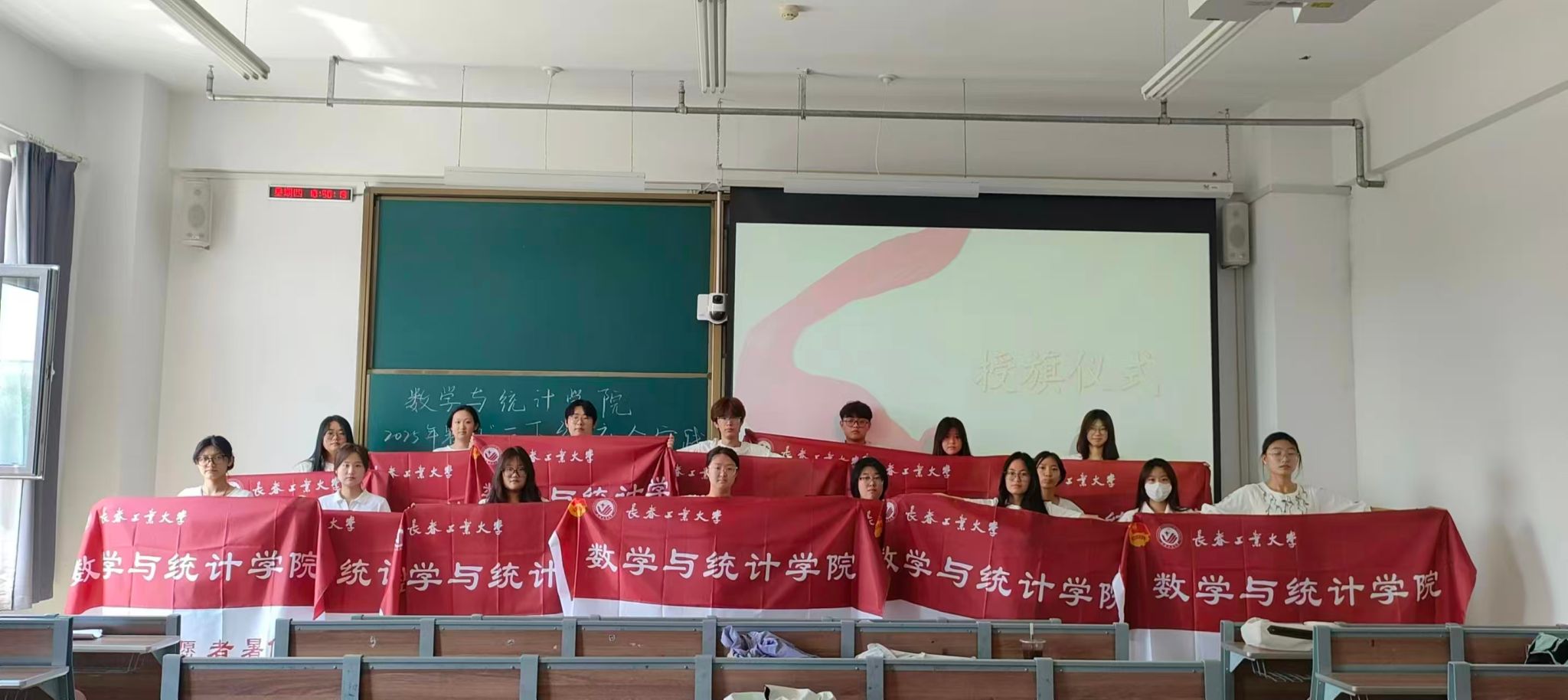 仪式上,庄园老师先阐述“三下乡”社会实践对学生成长、乡村发展的价值,列举学院往届实践中取得的成果,激励同学们把握实践机会。接着,对本次实践的主题方向、分组任务、行程安排以及成果提交规范进行细致说明,反复强调实践期间要重视人身安全、遵守当地风俗与团队纪律 。庄园老师向同学们提出期许,希望大家发挥数学与统计专业优势,在乡村调研中精准挖掘数据价值,在教育帮扶里创新知识传递;深入基层一线,触摸真实社会脉络,厚植家国情怀;借团队协作、沟通交流,提升解决实际问题的能力,以青春实干为乡村振兴添彩。随后,庄园老师为出征队伍授旗。在全体志愿者的铮铮誓言中活动圆满结束。