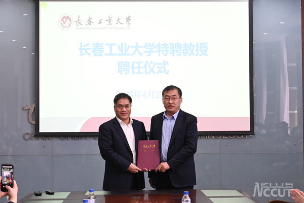 特聘教授。校长张明耀出席仪式并颁发聘书,副校长金光勇主持聘任仪式。