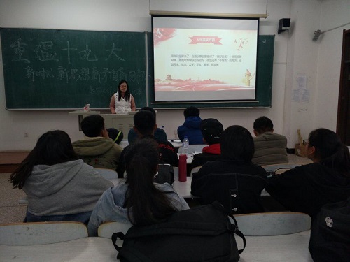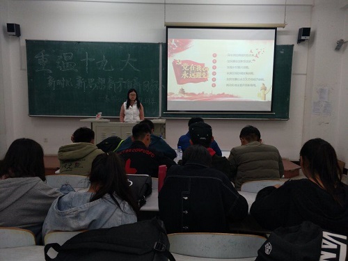 团委于2018年10月18日在教图楼201教室开展“学习筑梦”系列活动之“重温十九大之新时代新思想新矛盾新目标”。学院2018级主要学生团干部参加本次会议,团委副书记崔仕贤担任会议主讲人。